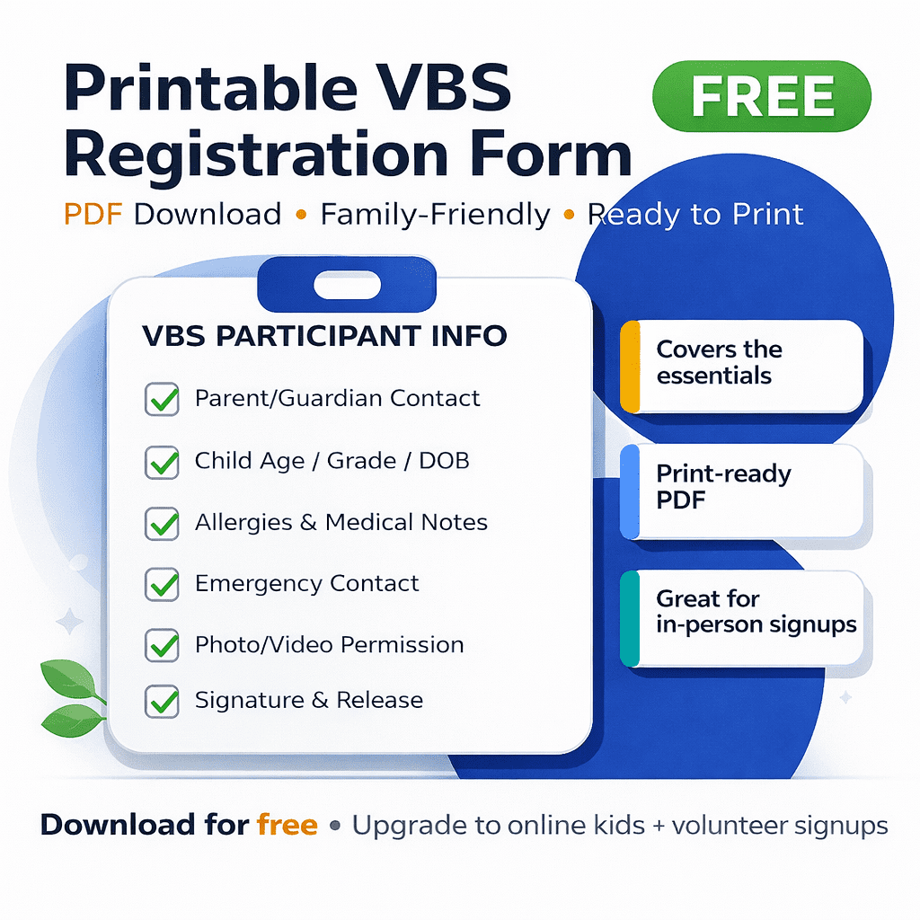 Download a free VBS participant registration form in PDF + editable DOC formats. Print it, customize it, and start collecting the right info from families—fast.