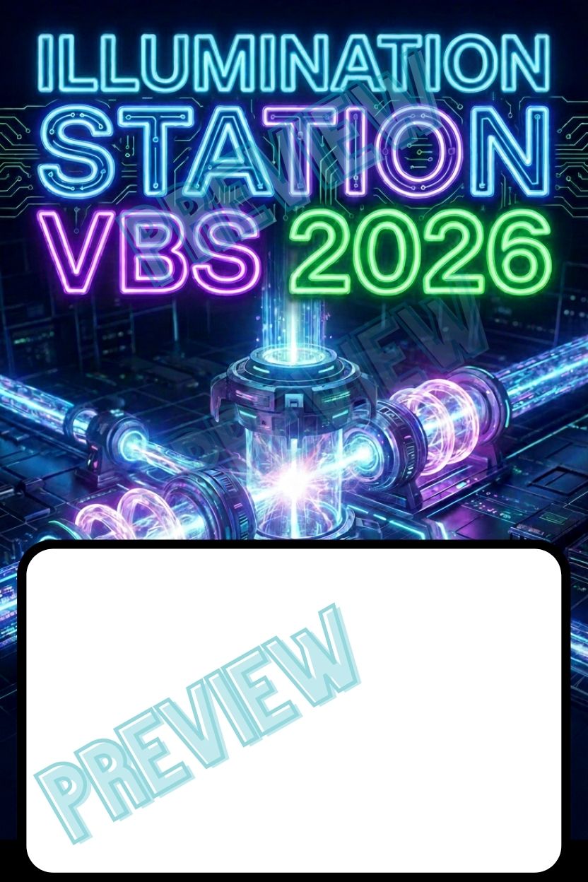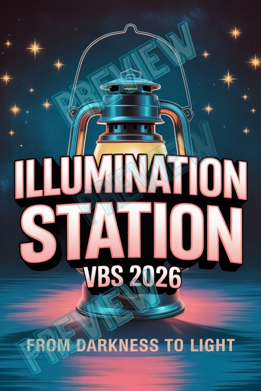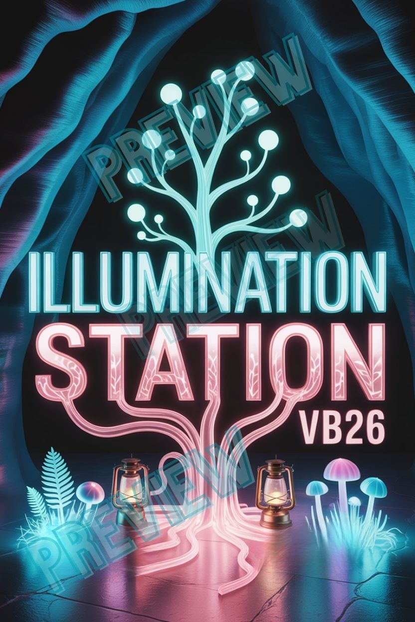 Bold, eye-catching Illumination Station VBS 2026 posters designed to instantly set the tone for your VBS theme. Perfect for lobbies, stages, screens, social media, and volunteer promos.